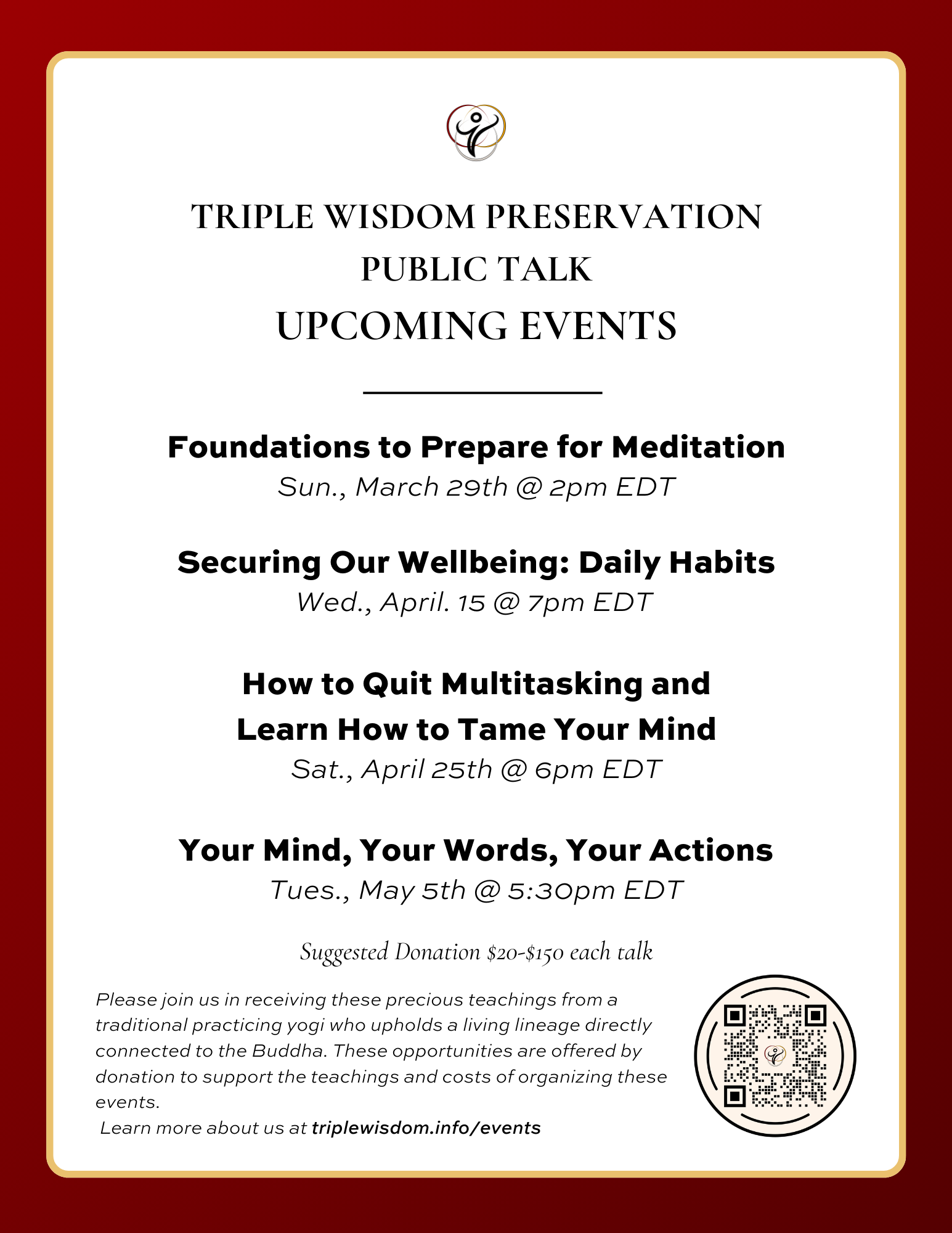 Cada primavera y otoño, Triple Wisdom Preservation colabora con estudiantes de medicina tradicional, practicantes del Dhamma, pequeños negocios y personas devotas de todo el mundo para llevar estos temas a su comunidad y transmitirlos en línea para nuestra audiencia global.